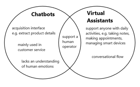 While Chatbots hold a crucial role in customer service (as elaborated above), a Virtual Assistant is a software-based agent that can support anyone (an employee at his workplace, a parent with their family) in performing daily activities. They can take notes, make appointments, get directions, check your flight status or manage smart devices.