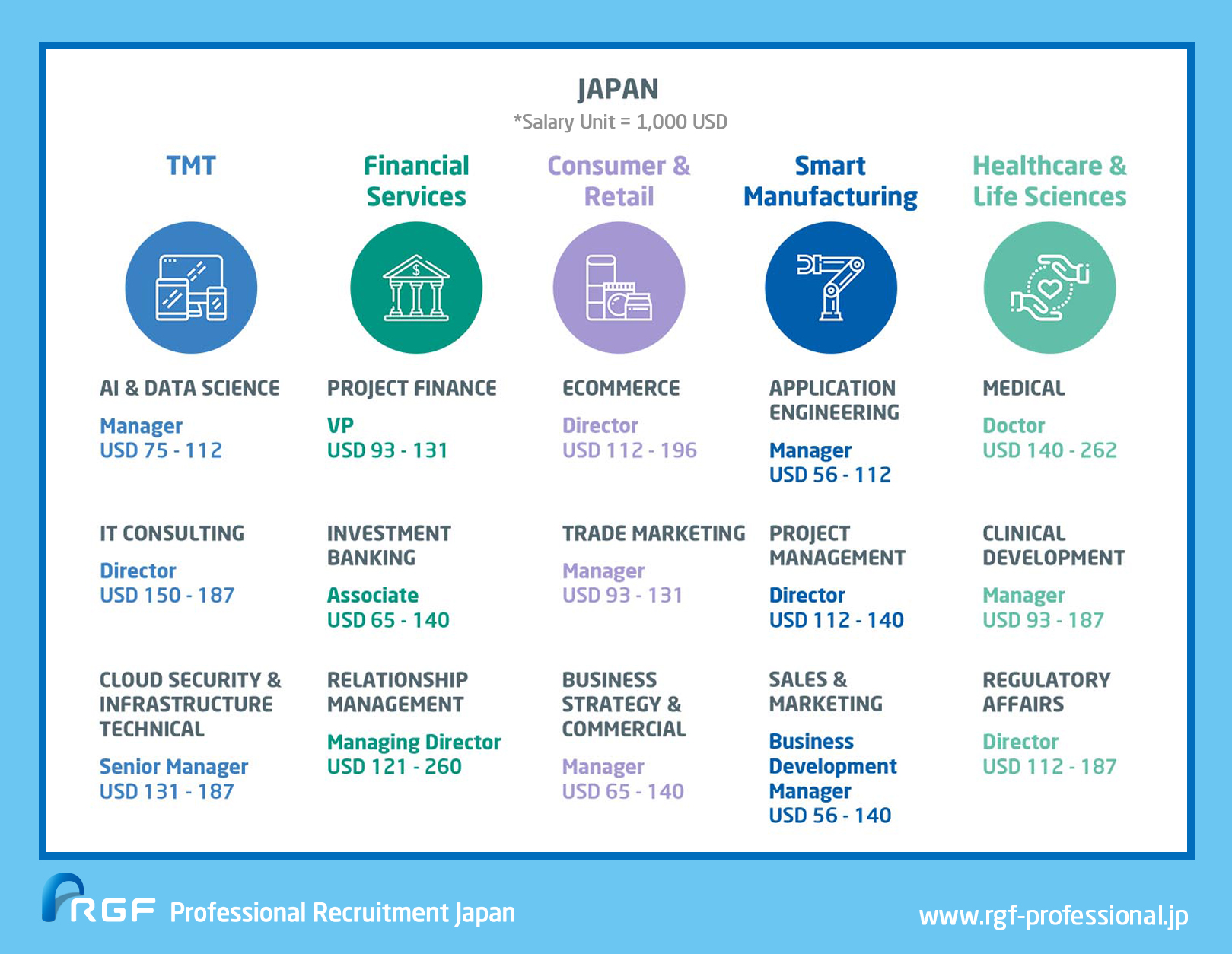 RGF’s Salary Watch: Japan report has been conducted with the aim of better understanding the salary trends and data across all industries and job levels in Japan. This report is based on an RGF-owned candidate pool covering more than 400,000 candidates (collected from February 2019 to February 2020) in our Japan database. The definition of annual basic salary used throughout this report does not include allowance, stock, bonus or any other additional benefits, and the salary exchange rate used is USD1 = JPY107. Due to the real-time nature of some of this data, RGF encourages readers to use its insights at their discretion.